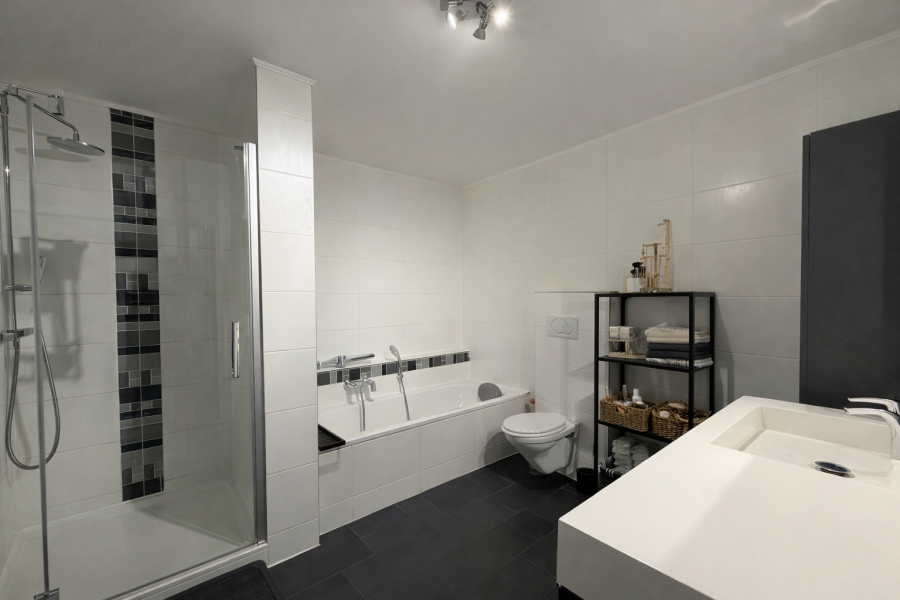 - Salle de bains avec baignoire et douche